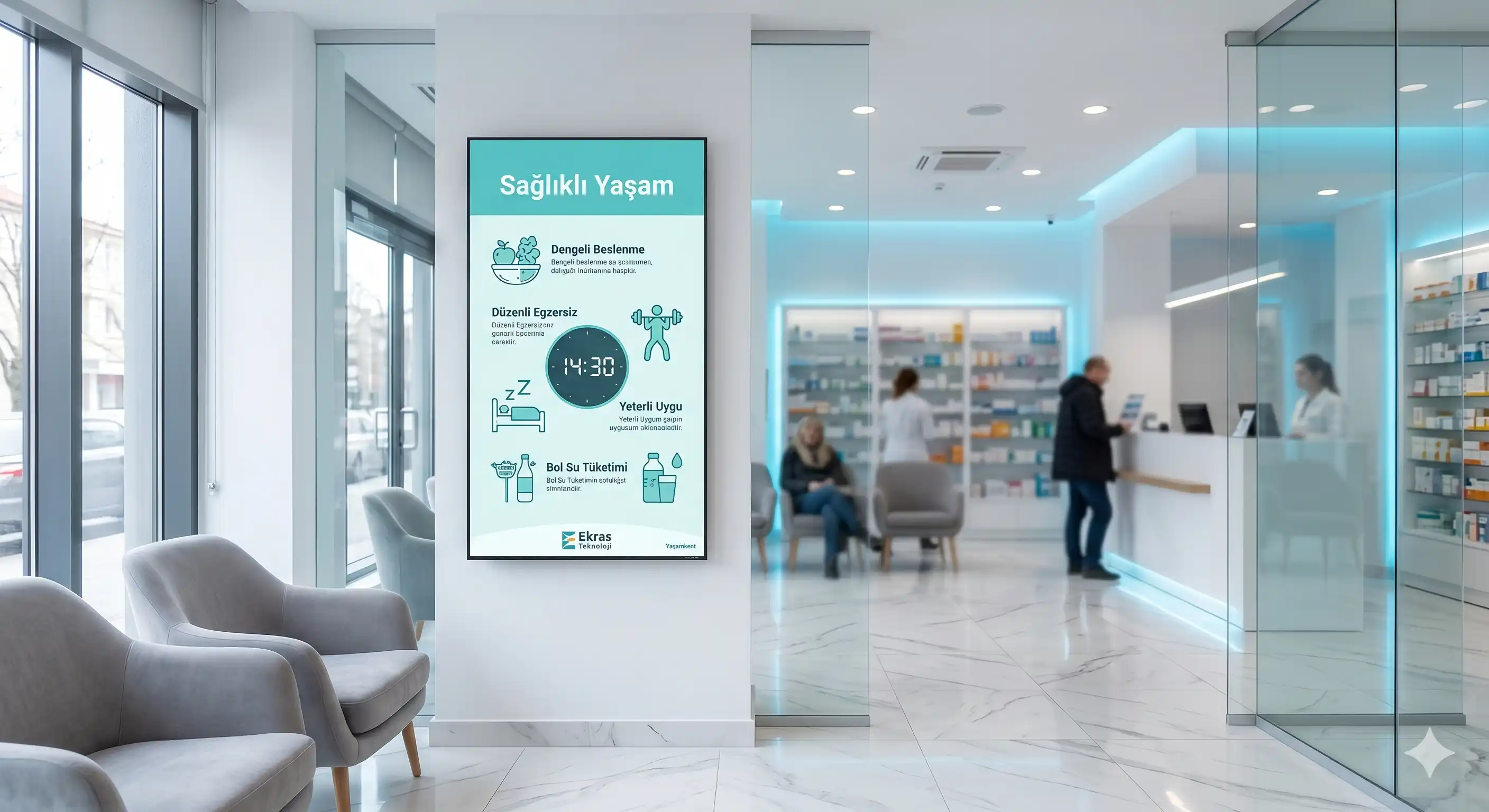 Bu bölgelerdeki özel poliklinikler ve eczaneler, kurumsal bilgilendirme ekranı kullanımından en fazla fayda sağlayan işletme tipleri arasında geliyor. Sebebi basit: bekleme süresi var ve bu süre bir iletişim fırsatıdır.