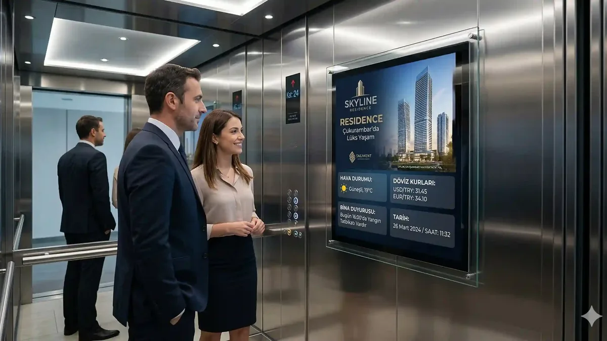 Asansörde geçen süre artık faydalı bilgilerle doluyor. Hava durumu, döviz, gündem, etkinlikler — bina içindeyken dışarıyla bağlantı kesilmiyor.